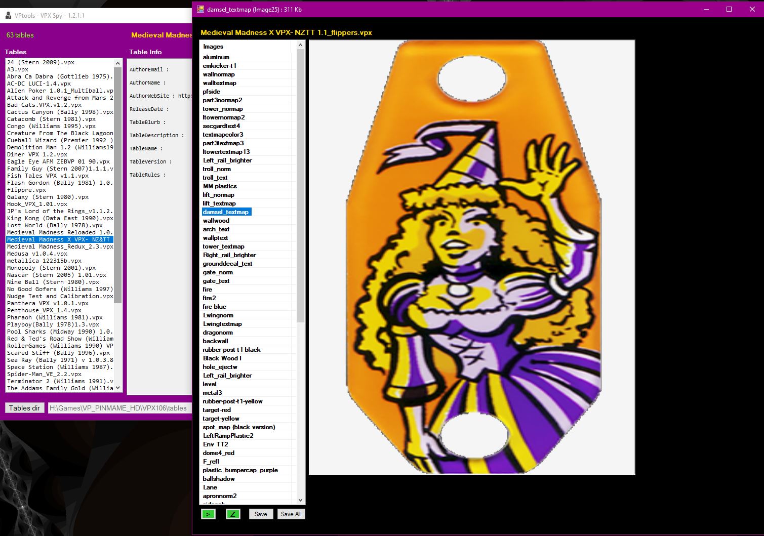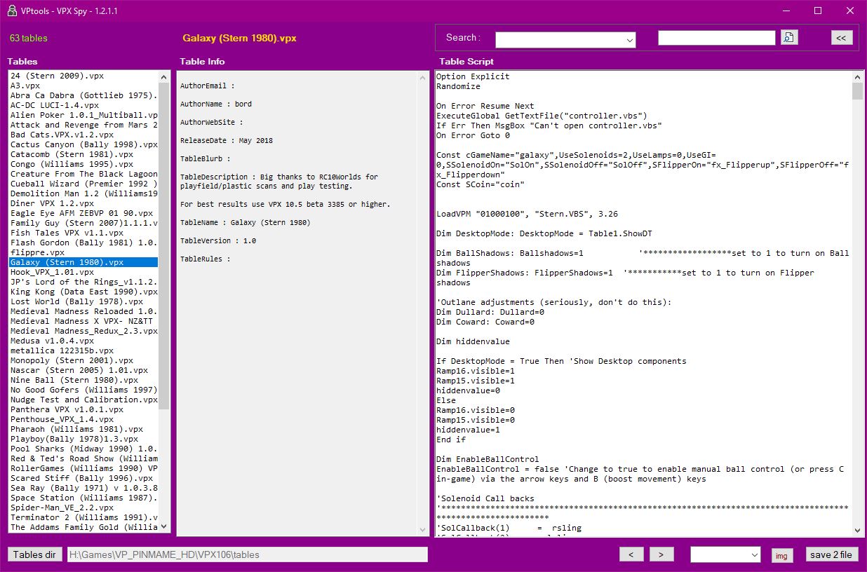 VPX SpyThis tool can be used to inspect the contents of a vpx file - which is a kind of container for various data (images, sounds, scripts, meta data)At this time it only handles table info, scripts and images but more functions will be added (suggestions welcome) Latest version : 1.2.1.2 ScriptsSelect a table and click the script button. A window will open showing the script and some search options. For your convenience, several popular search strings have been collected in a dropdown ;-)You can also save the script to a file. ImagesClick the 'img' button to open a new window for browsing through the images in the vpx file.Yes, you can do this in VP as well, but VPXspy adds: